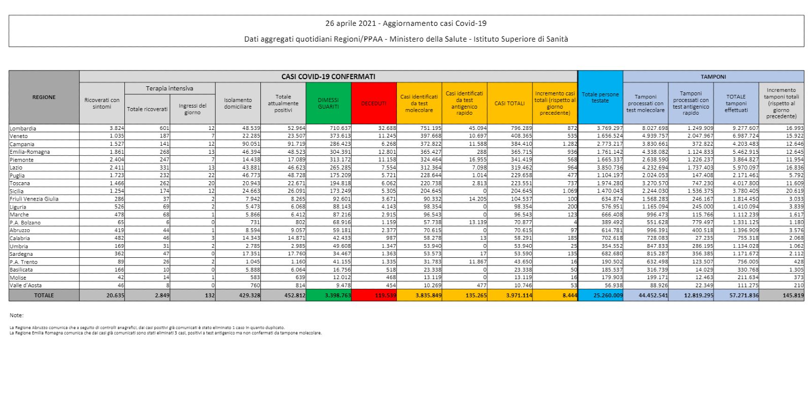 I dati sul coronavirus in Italia di oggi, lunedì 26 aprile