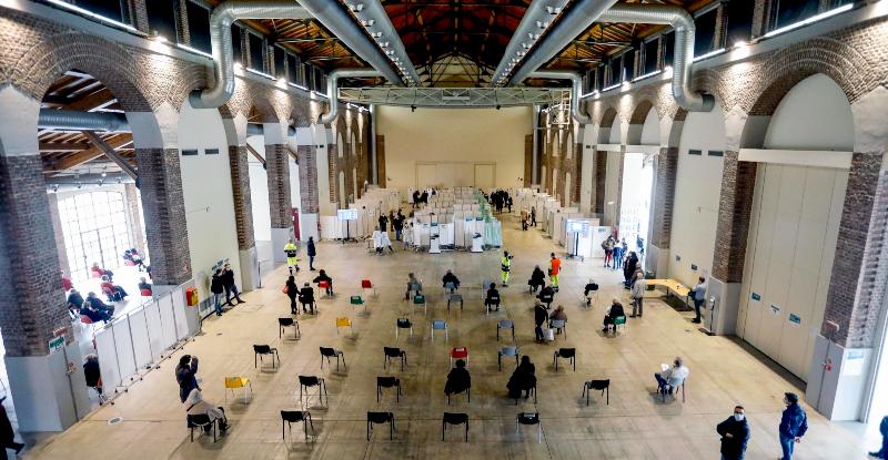 Il centro vaccinale allestito all'interno della Fabbrica del Vapore di Milano, 12 aprile 2021. (ANSA/ Mourad Balti Touati)
