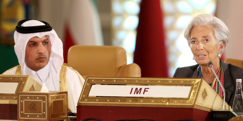 Il ministro delle Finanze del Qatar Ali Shareef Al Emadi, a sinistra, con Christine Lagarde, l'attuale presidente della Banca Centrale Europea, in un incontro del 2015 (AP Photo/Osama Faisal)