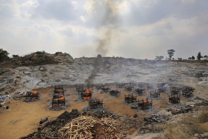 Pire funerarie per la cremazione dei morti di COVID-19 a Bangalore, nello stato del Karnataka (AP Photo/Aijaz Rahi)