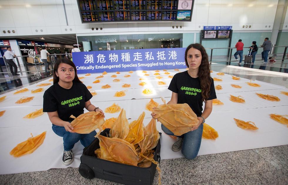 Attiviste di Greenpeace protestano contro il commercio illegale di vesciche natatorie di totoaba all’aeroporto di Hong Kong, il 28 maggio 2014: quelle che tengono in mano sono finte vesciche natatorie essiccate (EPA/ALEX HOFFORD, ANSA)