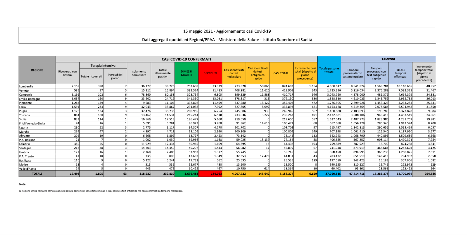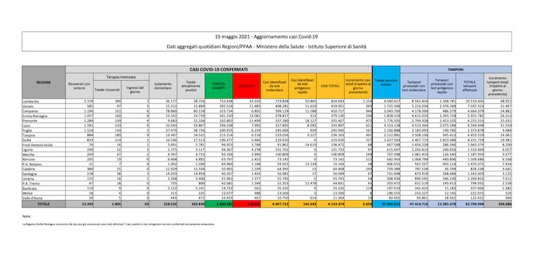 I dati sul coronavirus in Italia di oggi, sabato 15 maggio