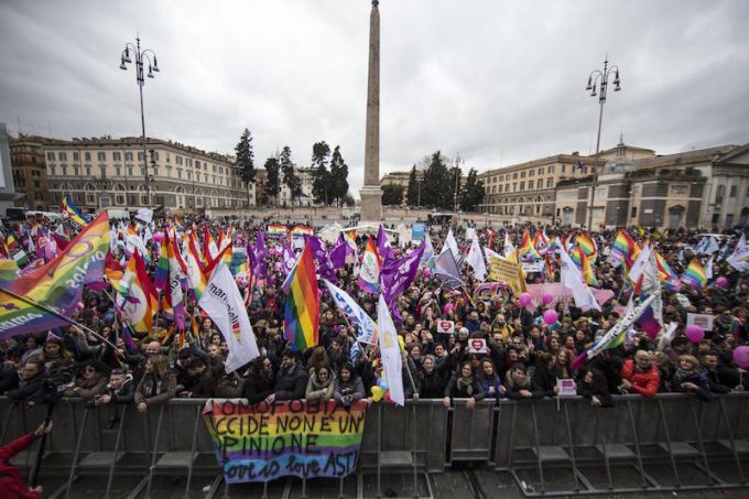 La manifestazione in Piazza del Popolo a Roma a sostegno del ddl Cirinnà, 5 marzo 2016 (ANSA/MASSIMO PERCOSSI)