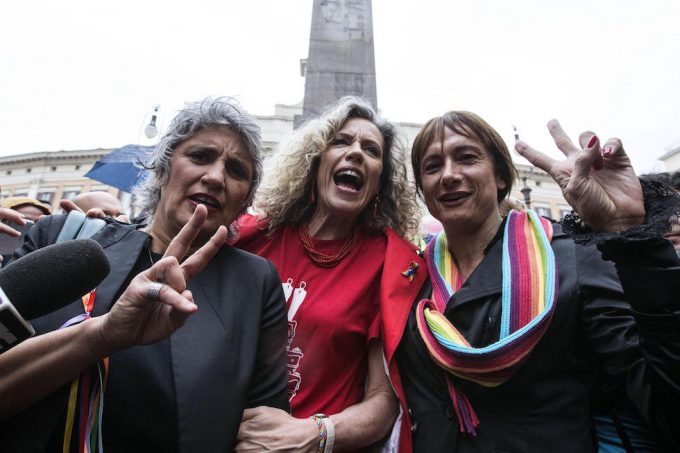 Monica Cirinnà con Paola Concia e Vladimir Luxuria davanti a Montecitorio durante il voto sulle unioni civili alla Camera, Roma, 11 maggio 2016 (ANSA/ANGELO CARCONI)