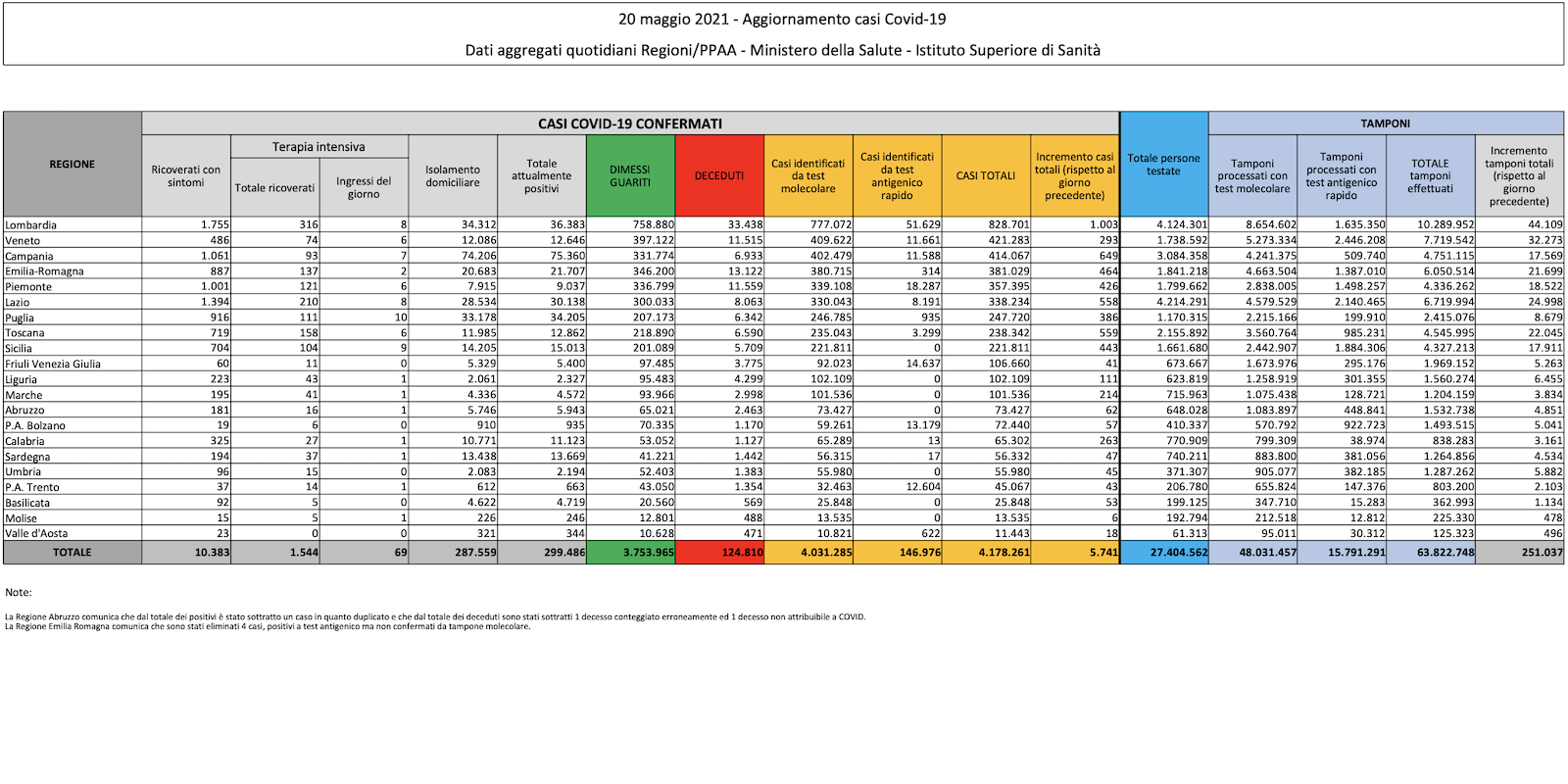I dati sul coronavirus in Italia di oggi, giovedì 20 maggio