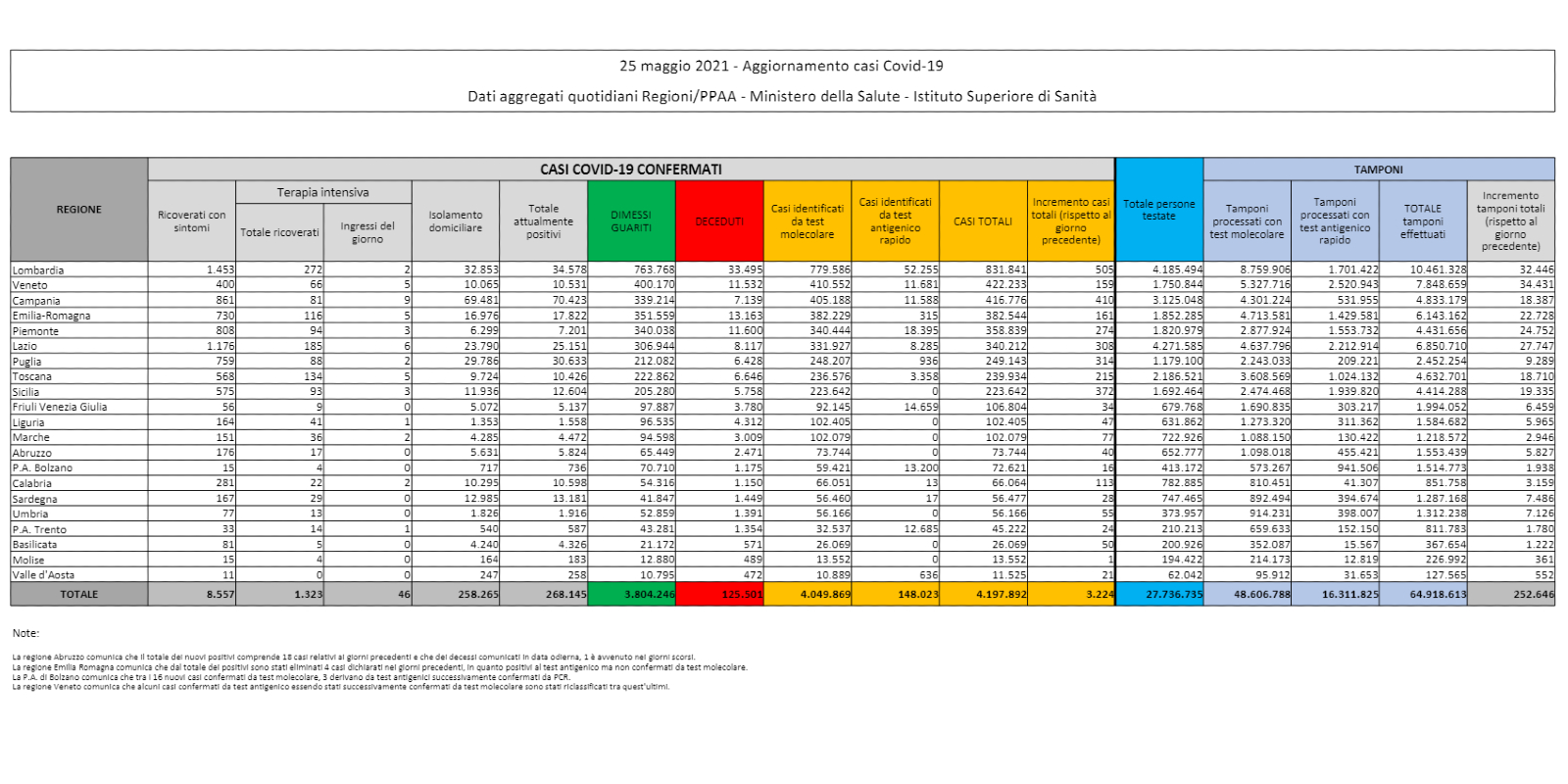 I dati sul coronavirus in Italia di oggi, martedì 25 maggio