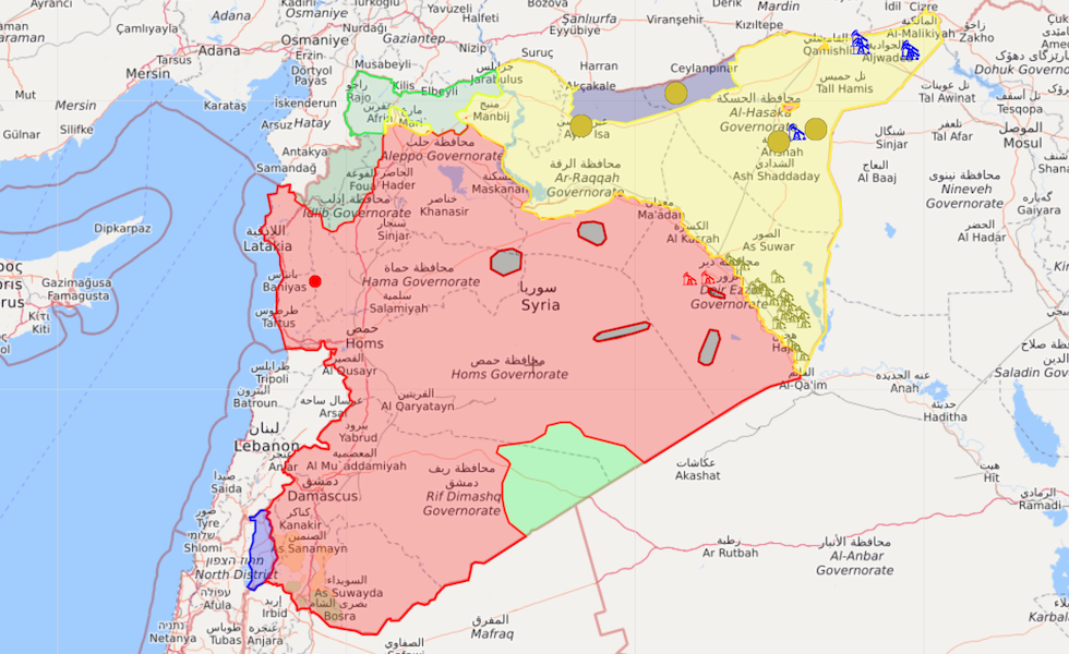 L’attuale situazione in Siria: in rosso il regime di Assad e i suoi alleati, in giallo i curdi, in verde chiaro a nord i gruppi sostenuti e finanziati dalla Turchia in funzione anti-curda, in verde scuro a ovest i ribelli dominati dalle fazioni radicali e jihadiste (Liveuamap)