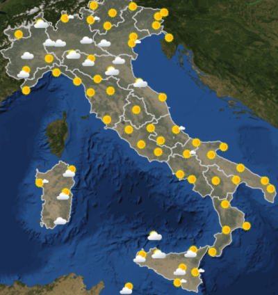 Secondo il servizio meteorologico dell’Aeronautica militare, venerdì 28 maggio in Italia sarà una giornata dal tempo prevalentemente sereno o poco nuvoloso. Al mattino ci saranno un po’ di nuvole in Piemonte, Lombardia, Emilia-Romagna, Sicilia e Sardegna. Nel pomeriggio sarà sereno ovunque tranne in Veneto, in Sicilia e in Sardegna, dove la sera il cielo sarà nuvoloso, ma non pioverà.