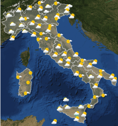 Secondo il servizio meteorologico dell’Aeronautica militare, sabato 29 maggio in Italia sarà una giornata dal tempo variabile. Al mattino il cielo sarà sereno o poco nuvoloso un po’ ovunque, tranne nella Sicilia meridionale dove sono previste piogge isolate. Al pomeriggio pioverà anche nella Lombardia settentrionale, in Trentino, Friuli e sull’Appennino tosco-emiliano. Alla sera invece sono previste piogge sparse nel Piemonte meridionale, in Liguria, nel Veneto occidentale, nel Lazio interno e in Molise. Nella notte ci saranno temporali isolati nel basso Piemonte e le piogge si estenderanno alla Puglia settentrionale e alla Calabria ionica.