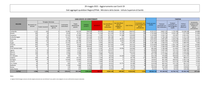 I dati sul coronavirus in Italia di oggi, sabato 29 maggio