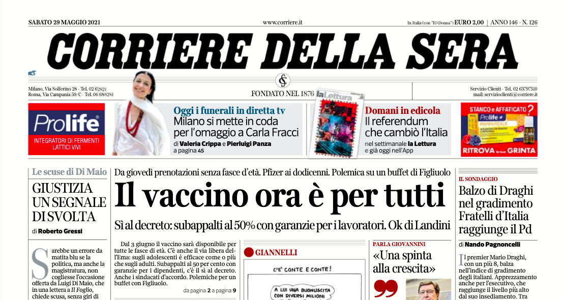 Le prime pagine di sabato 29 maggio 2021