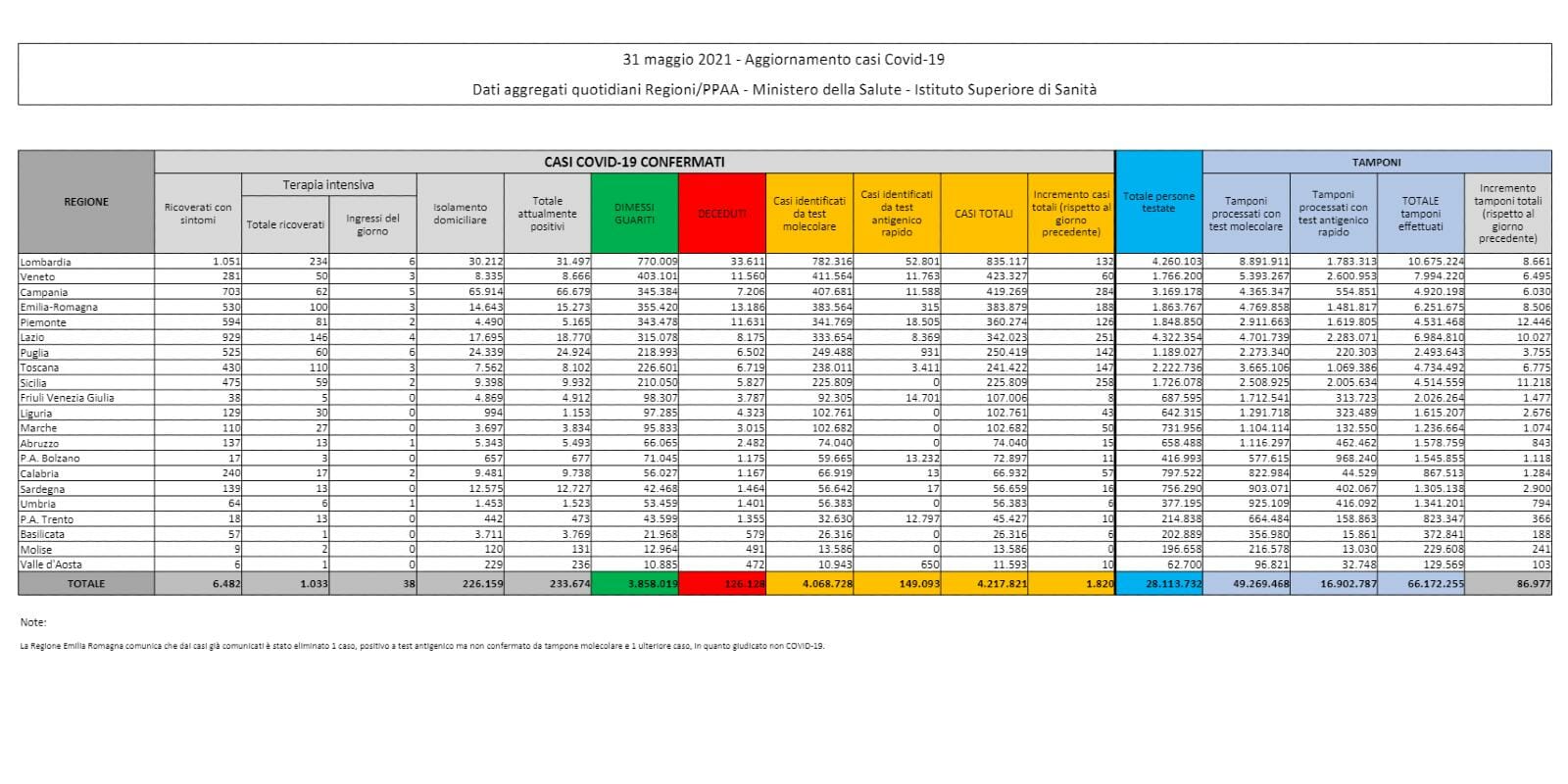 I dati sul coronavirus in Italia di oggi, lunedì 31 maggio