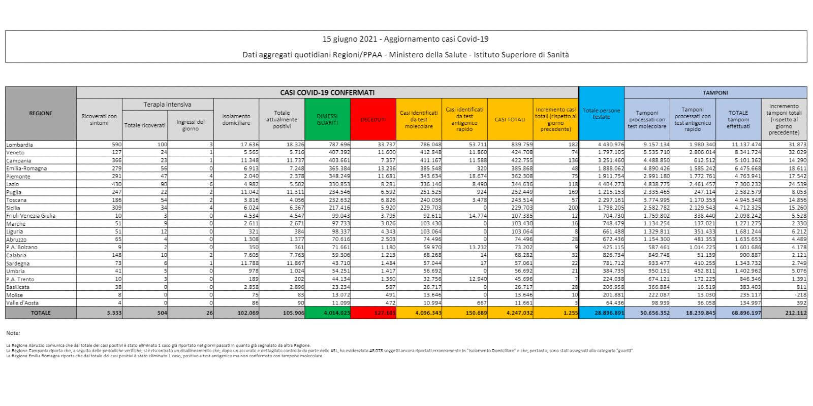 I dati sul coronavirus in Italia di oggi, martedì 15 giugno