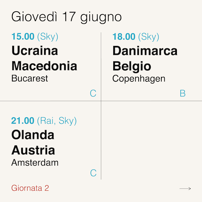 Mercoledì l’Italia ha ottenuto la qualificazione agli ottavi di finale degli Europei battendo la Svizzera a Roma con un altro 3-0. Giovedì 17 giugno sono arrivate anche le qualificazioni di Belgio e Olanda, mentre la Macedonia del Nord è la prima eliminata del torneo.
