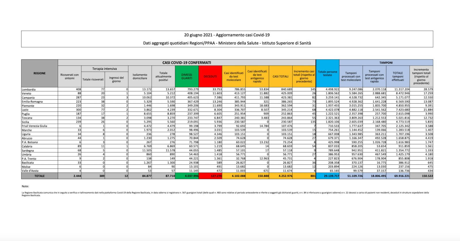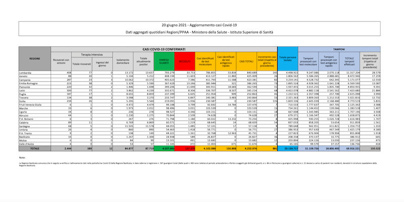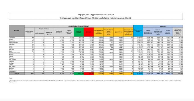 I dati sul coronavirus in Italia di oggi, domenica 20 giugno