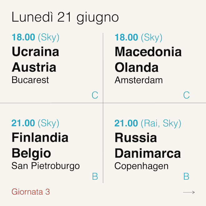 Domenica l’Italia ha vinto la sua terza partita consecutiva ai gironi, che le ha garantito il passaggio del turno da prima classificata. Lunedì ha conosciuto la sua avversaria agli ottavi, l’Austria, che nella partita decisiva del suo girone ha battuto l’Ucraina.