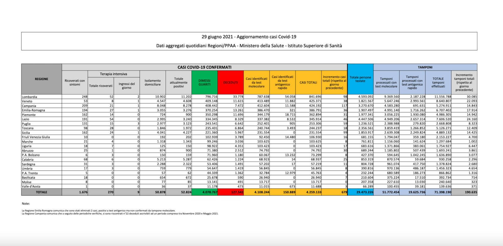 I dati sul coronavirus in Italia di oggi, martedì 29 giugno