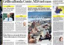 Il duro attacco e la separazione tra Beppe Grillo e Giuseppe Conte sono sulle prime pagine di tutti i quotidiani, che commentano l’ultimo sviluppo dello scontro di potere in atto nel Movimento 5 Stelle come il possibile capitolo finale del partito. Domani mette in prima pagina un’immagine dal video delle violenze compiute nell’aprile del 2020 dagli agenti di polizia nel carcere di Santa Maria Capua Vetere, mentre c’è spazio anche per l’intenzione del governo di sospendere il cashback.