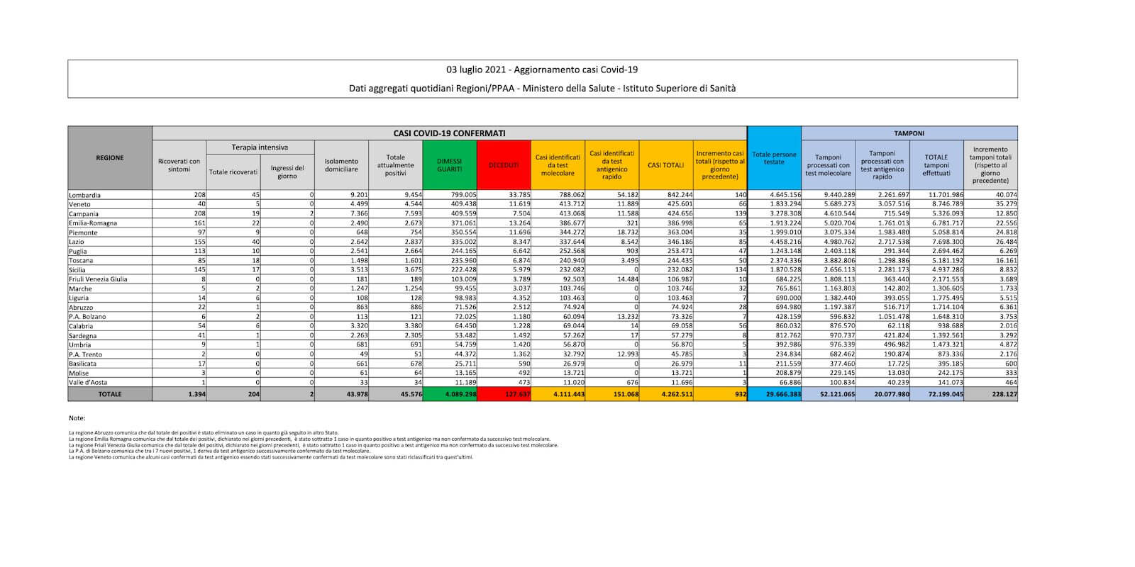 I dati sul coronavirus in Italia di oggi, sabato 3 luglio
