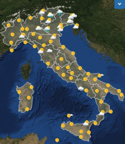 Secondo le previsioni del Servizio Meteorologico dell’Aeronautica Militare, domenica sarà una bella giornata quasi ovunque e quasi in tutta Italia. L’unica eccezione sarà costituita dal Trentino-Alto Adige e dal Cadore (Veneto), dove pioverà per alcune ore in mattinata. Nel pomeriggio la situazione migliorerà e nel resto della giornata sarà sereno in tutte le regioni, salvo qualche nuvola sparsa ancora nel Nord-Est.