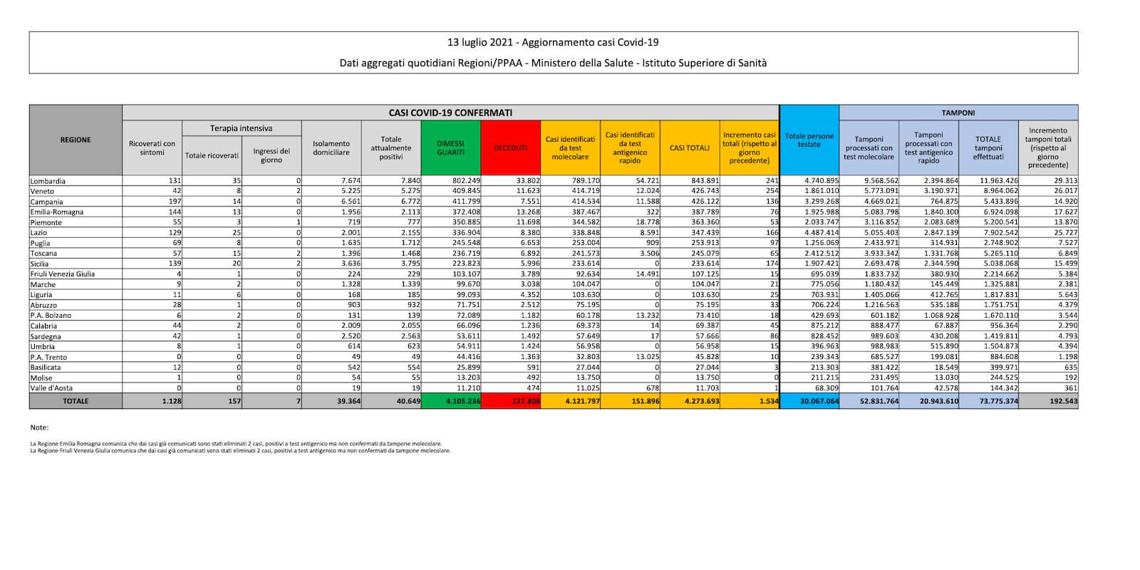 I dati sul coronavirus in Italia di oggi, martedì 13 luglio
