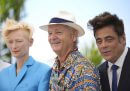 Adrien Brody, Bill Murray, e Wes Anderson al photocall di The French Dispatch al festival di Cannes, 13 luglio (AP Photo/Brynn Anderson)