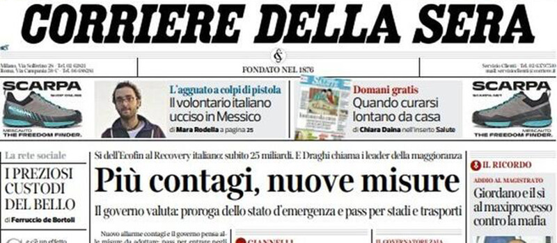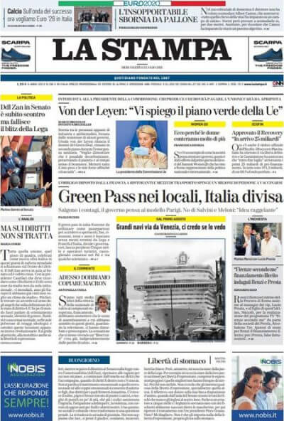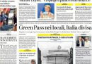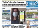 Ci sono notizie diverse in apertura sui giornali di oggi: alcuni titolano sui dati in aumento dei contagi dovuti alla variante delta del coronavirus e sulle possibili nuove restrizioni per limitarne la diffusione, altri si occupano dell’inchiesta della Procura di Roma per la quale è indagato per finanziamento illecito il leader di Italia Viva Matteo Renzi, altri ancora aprono sull’inizio della discussione al Senato sul disegno di legge Zan. La Stampa intervista la presidente della Commissione Europea Von der Leyen, Repubblica e il Dubbio titolano sulla visita del presidente del Consiglio Draghi e della ministra della Giustizia Cartabia nel carcere di Santa Maria Capua Vetere, e i giornali sportivi, finiti gli Europei, tornano a occuparsi di calciomercato.