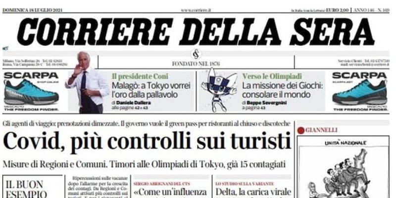 Oggi quasi tutte le aperture dei giornali sono dedicate all’aumento dei contagi da coronavirus, agli effetti dell’epidemia sul turismo e al possibile obbligo di utilizzo del Green Pass per alcune categorie come i dipendenti statali o per entrare in luoghi come ristoranti e discoteche. Repubblica ha dedicato il titolo principale della prima pagina alla scoperta del primo contagio di coronavirus nel villaggio olimpico di Tokyo e alle possibile conseguenze sullo svolgimento dei Giochi olimpici. Il Corriere della Sera, il Messaggero, il Giornale e la Stampa si occupano delle vacanze a rischio a causa della nuova crescita dei contagi. Molti quotidiani sportivi hanno titoli in prima pagina che riguardano il calciomercato.