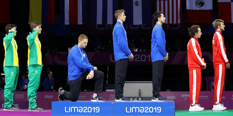 Nell’agosto 2019, durante la cerimonia di premiazione del fioretto a squadre sempre in occasione dei Giochi panamericani, lo schermidore statunitense Race Imboden si era invece inginocchiato in segno di protesta contro il razzismo (gesto che si è diffuso molto nelle competizioni sportive dal 2016, quando fu introdotto dal giocatore di football americano Colin Kaepernick) e contro l’assenza di leggi che limitano la vendita di armi, tra le altre cose.
