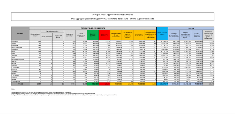 I dati sul coronavirus in Italia di oggi, martedì 20 luglio