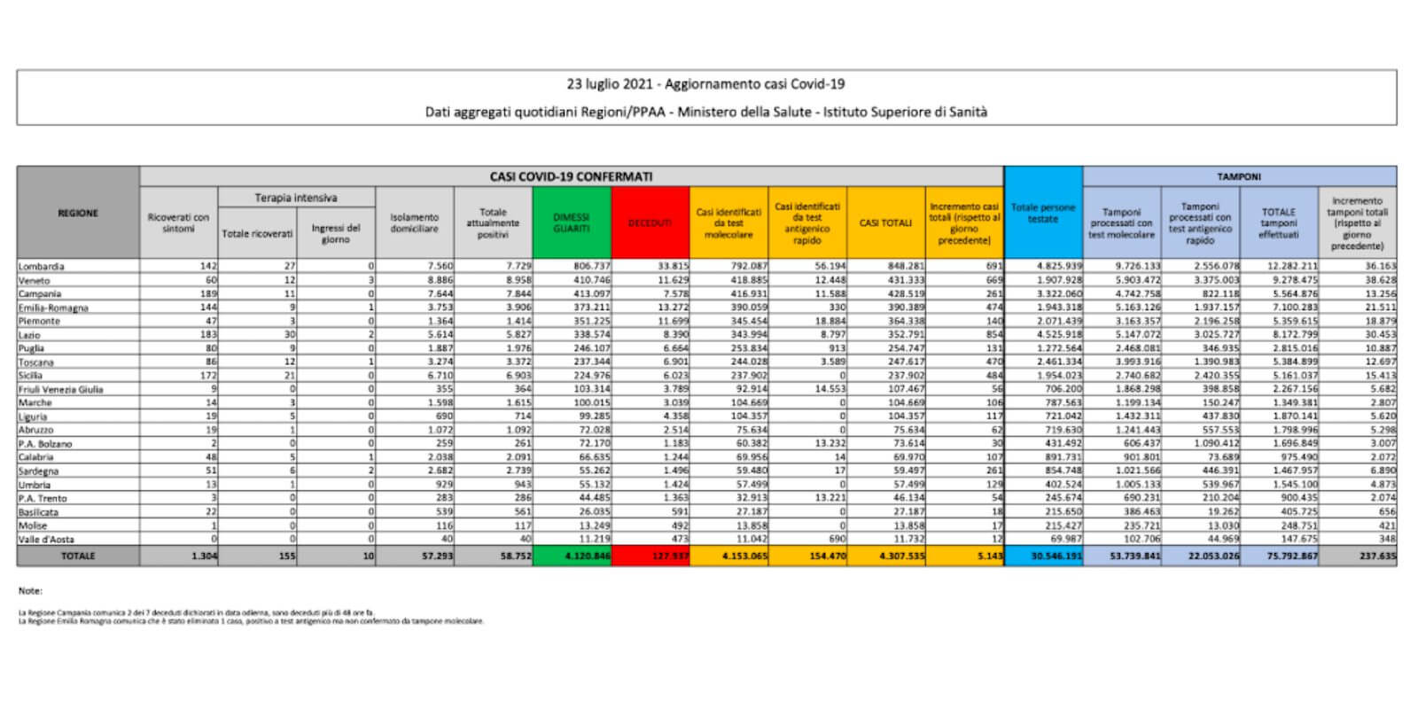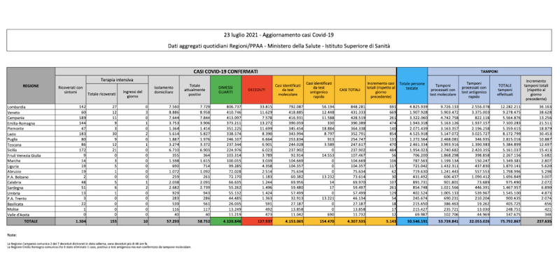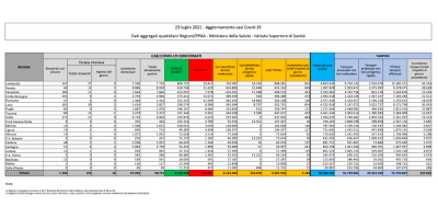 I dati sul coronavirus in Italia di venerdì 23 luglio