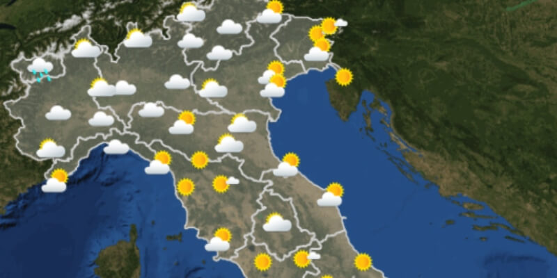 Secondo il servizio meteorologico dell’Aeronautica militare, sabato 24 luglio in Italia sarà una giornata dal tempo prevalentemente sereno o poco nuvoloso al Centro-Sud e molto nuvoloso con piogge sparse al Nord. Al mattino il cielo sarà coperto in Piemonte, Liguria di Levante, Lombardia e Trentino e pioverà in Valle d’Aosta. Nel pomeriggio le piogge si estenderanno al Piemonte e al Trentino, dove la sera ci saranno temporali, previsti nella notte anche in Valle d’Aosta.