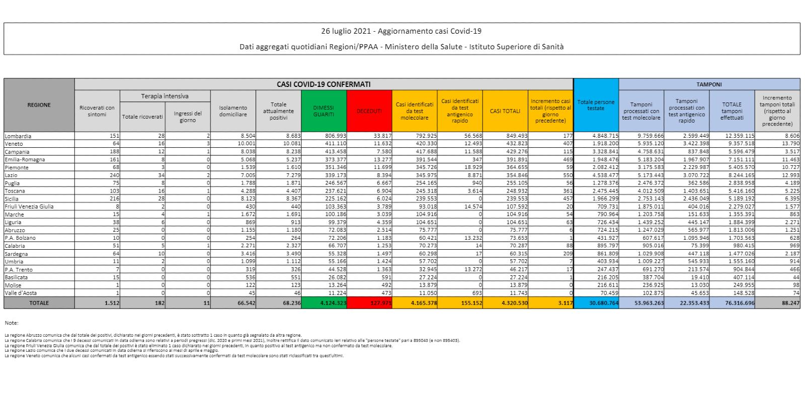 I dati sul coronavirus in Italia di oggi, lunedì 26 luglio
