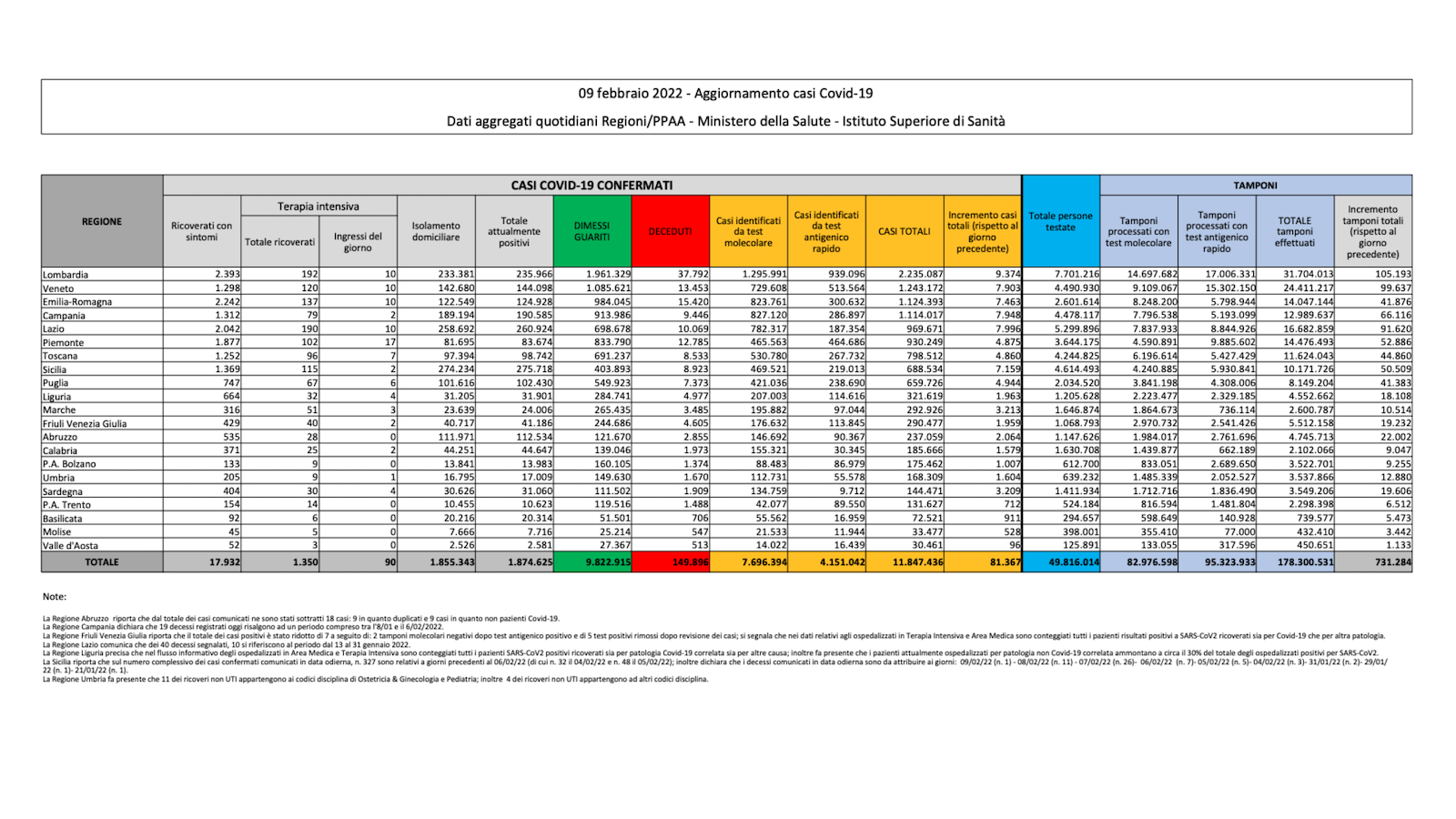 Le regioni che hanno registrato più casi nelle ultime 24 ore sono Lombardia (9.374), Lazio (7.996), Campania (7.948), Veneto (7.903), Emilia-Romagna (7.463).