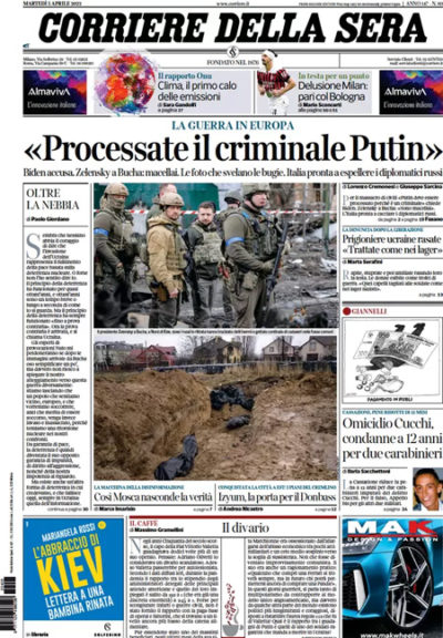 L’apertura dei giornali di oggi è dedicata alle violenze compiute dai russi sui civili ucraini nella cittadina di Bucha, vicino a Kiev, dove ieri si è recato in visita il presidente ucraino Zelensky, e alle reazioni in occidente alla diffusione delle immagini e delle testimonianze sul massacro: mentre i paesi dell’Unione Europea discutono di nuove sanzioni e dell’eventualità di bloccare le importazioni di gas russo, sulla quale non sembra ci sia un accordo, il presidente degli Stati Uniti Biden accusa il presidente russo Putin di aver compiuto crimini di guerra. I giornali sportivi commentano il pareggio con il Bologna del Milan, che riprende il primo posto in classifica in Serie A.