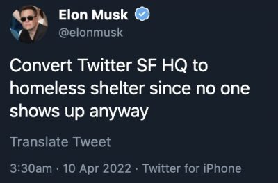 Lo stesso giorno, Musk aveva pubblicato un altro sondaggio, poi cancellato, chiedendo ai propri follower se fossero d’accordo a: «Convertire la sede di San Francisco di Twitter in un rifugio per i senzatetto, visto che tanto non ci va mai nessuno».