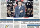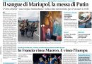 Quasi tutti i giornali di oggi titolano in apertura sui risultati del ballottaggio delle elezioni presidenziali in Francia, con la vittoria su Marine Le Pen di Emmanuel Macron, che viene così confermato per il secondo mandato. Qualche giornale apre invece sulle celebrazioni di oggi per la festa della Liberazione, a cui alcuni dedicano integralmente la prima pagina, mentre altri seguono le notizie sulla guerra in Ucraina, con i bombardamenti russi che non si sono interrotti neanche nel giorno della Pasqua ortodossa, e la visita a Kiev del segretario di Stato americano Blinken e del segretario alla Difesa Austin. I giornali sportivi si occupano della vittoria sulla Lazio del Milan, che supera così l’Inter in testa alla classifica di Serie A.