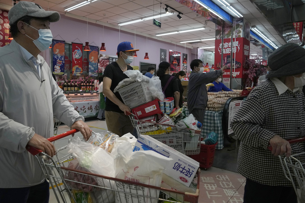 Alcune persone fanno scorte di cibo in un supermercato del distretto di Chaoyang (AP Photo/Ng Han Guan)