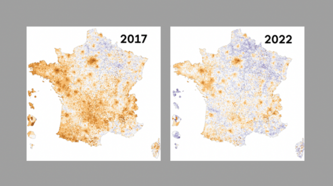 Evoluzione del voto tra il 2017 e il 2022 nei comuni francesi. Emmanuel Macron è rappresentato dal colore arancione e Marine Le Pen dal colore viola (Fonte FranceInfo)