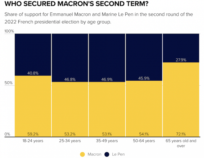 Macron deve inoltre la sua vittoria alla lealtà degli elettori più anziani, che non solo lo hanno sostenuto, ma che rappresentano anche la fascia di età con la più alta affluenza alle urne. Chi ha tra i 18 e i 24 anni ha sempre votato a favore di Emmanuel Macron, ma il tasso di astensione è stato del 41 per cento.