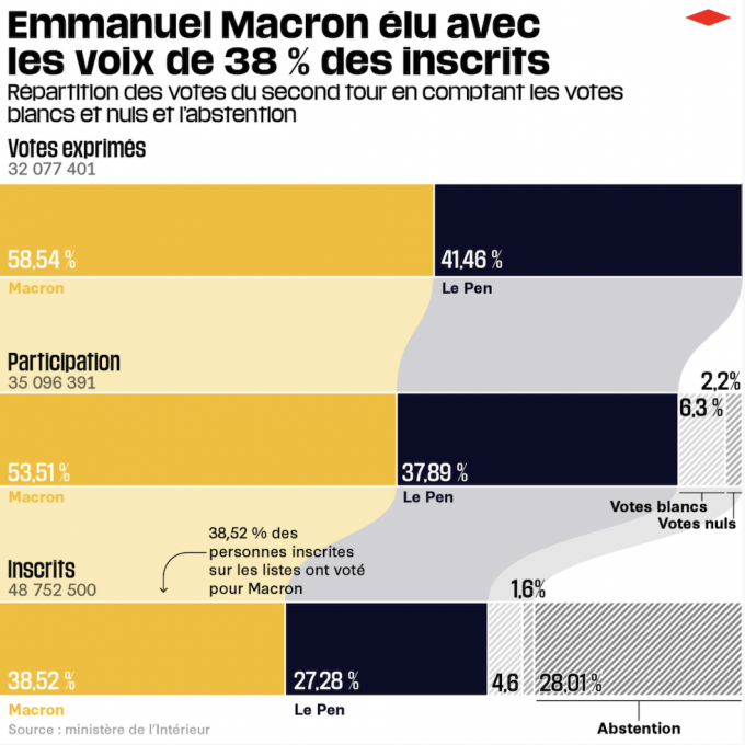 Il giudizio di Mélenchon si basa su un calcolo che tiene conto anche delle schede bianche, di quelle nulle e del tasso di astensione (che è stato assai alto al ballottaggio). Considerando dunque il rapporto fra i voti ricevuti e le persone iscritte al voto (poco meno di 49 milioni), Macron è stato eletto con il 38,52 per cento del voto degli iscritti, che è il secondo peggior risultato per un presidente da quando è iniziata la Quinta Repubblica. Dopo il maggio del 1968, alle elezioni del 1969 ci fu un’astensione molto alta, pari al 31,15 per cento, e Georges Pompidou fu eletto presidente grazie ai voti del 37,5 per cento degli elettori e delle elettrici iscritte.