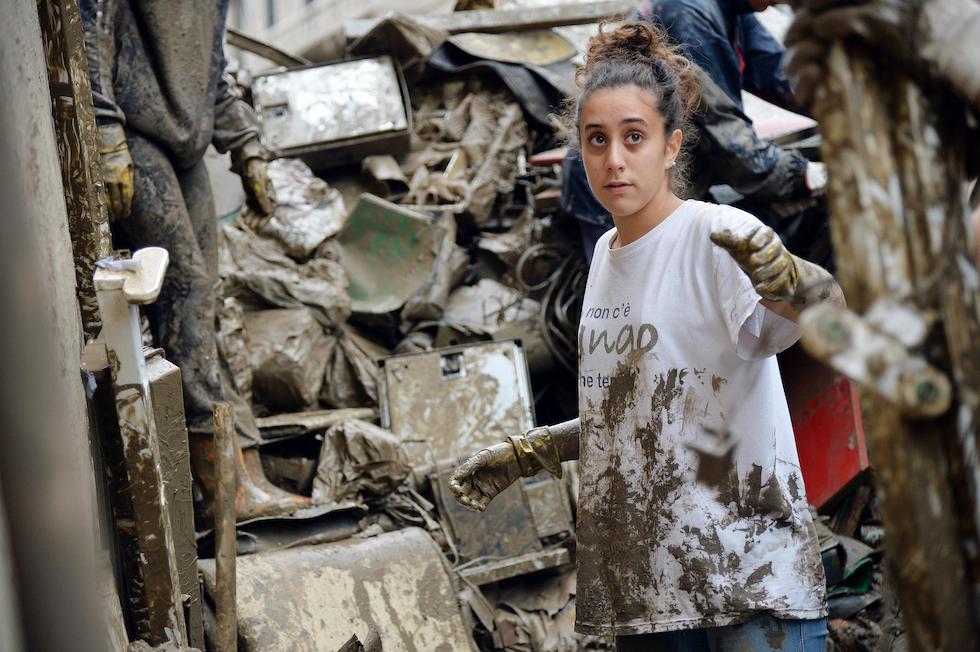 Una ragazza volontaria in una strada di Genova dopo le grandi piogge del 2014 (ANSA/ LUCA ZENNARO)