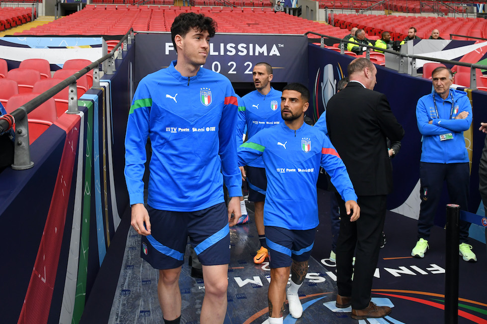 Bastoni e Insigne entrano in campo per l’allenamento dell’Italia a Wembley (Claudio Villa/Getty Images)