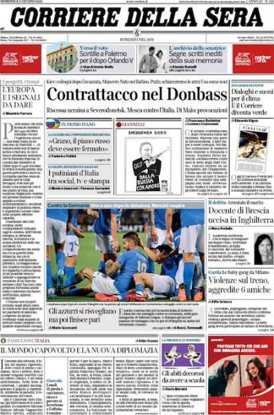 I giornali di stamattina aprono con notizie diverse fra loro, che vanno dal contrattacco dell’esercito ucraino a Severodonetsk al salario minimo passando per le tensioni interne alla maggioranza di governo in Italia. Sui giornali sportivi si parla soprattutto di calciomercato ma anche del sorprendente pareggio della Nazionale italiana di calcio maschile contro la Germania in Nations League.