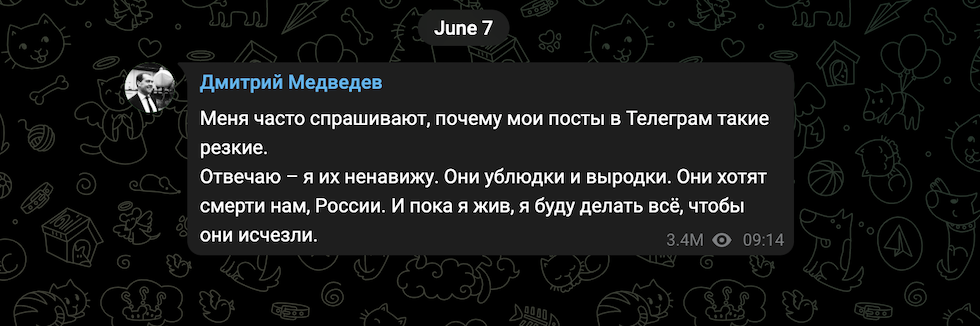 In realtà la dichiarazione di Medvedev non parla esplicitamente degli occidentali. Su Telegram, Medvedev ha scritto: «Spesso mi viene chiesto perché i miei post su Telegram sono così duri. La risposta è che li odio. Sono dei bastardi e dei degenerati. Vogliono la morte per noi, la Russia. E finché sarò vivo, farò di tutto per farli sparire».
