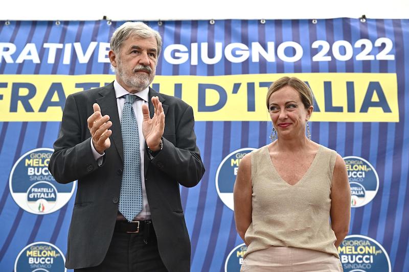 La leader di Fratelli d’Italia, Giorgia Meloni, e il sindaco uscente di Genova, Marco Bucci il 6 giugno 2022 (ANSA/Luca Zennaro)