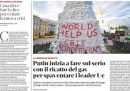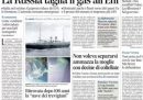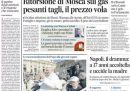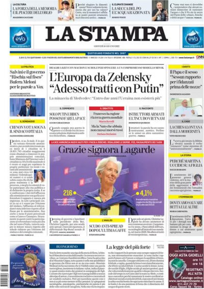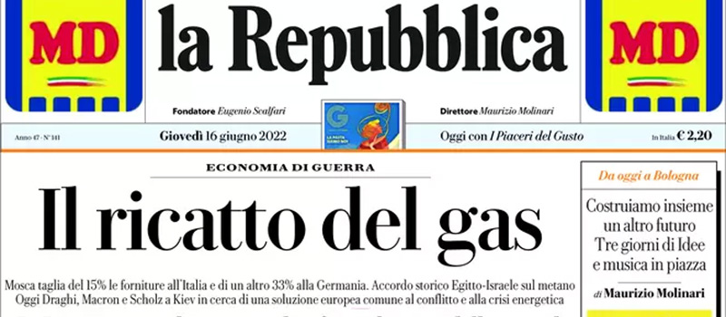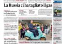 La decisione dell’azienda di stato russa Gazprom di ridurre la quantità di gas inviata all’Italia e alla Germania è la notizia in apertura sulla maggior parte dei giornali di oggi. Le altre notizie principali sono il viaggio di oggi a Kiev del presidente del Consiglio Draghi, del presidente francese Macron e del cancelliere tedesco Scholz per incontrare il presidente ucraino Zelensky, l’annuncio della Banca Centrale Europea di nuove misure per contrastare la crescita dello spread, salito dopo la decisione della settimana scorsa sull’aumento dei tassi, mentre Avvenire e il Manifesto si occupano dei dati diffusi dall’ISTAT sulla povertà in Italia, e il Dubbio e il Riformista aprono sulle assoluzioni nel primo processo per il fallimento di Banca Etruria.