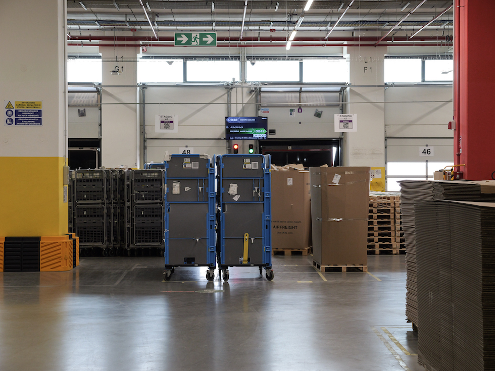 In questo periodo dentro BLQ1 ci sono dei lavori in corso che permetteranno di automatizzare maggiormente le operazioni di scarico: si stanno allestendo grossi tapis roulant che arriveranno fino all’imbocco dei bilici e che permetteranno agli addetti allo scarico di prendere i pacchi contenenti i prodotti e di affidarli immediatamente a un nastro trasportatore. Attualmente è ancora richiesto l’uso di muletti o di carrelli detti transpallet che si conducono a mano (possono essere elettrici o meno): vengono usati per spostare le merci dai camion fino a uno dei tanti nastri trasportatori già in uso o, nel caso dei pacchi più grandi, direttamente alle postazioni dei lavoratori che si occupano della “ricezione dei prodotti”.