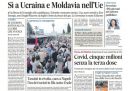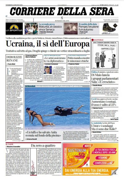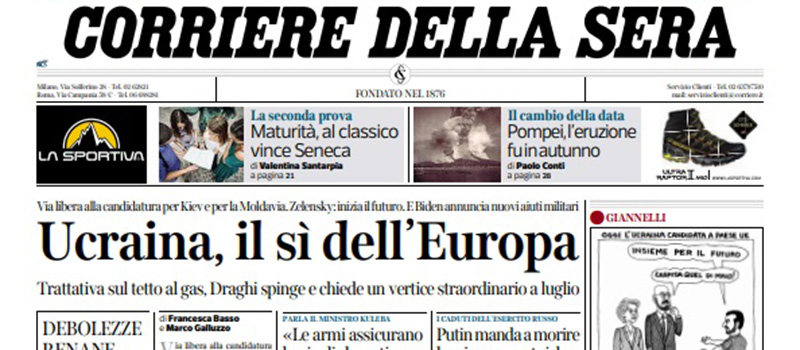 La decisione del Consiglio Europeo riunito ieri di accettare la candidatura di Ucraina e Moldavia per entrare nell’Unione Europea è la notizia principale in apertura sui giornali di oggi, ma molti associano a questa la discussione fra i paesi europei sull’istituzione di un prezzo massimo di acquisto per il gas, con la proposta di Italia e Francia di un vertice straordinario sul tema nel mese di luglio. Il Manifesto, Domani e il Giorno titolano invece sulle preoccupazioni per la siccità in Italia, mentre il Fatto e Libero si occupano dei parlamentari usciti dal Movimento 5 Stelle per entrare nel nuovo gruppo formato dal ministro degli Esteri Di Maio.