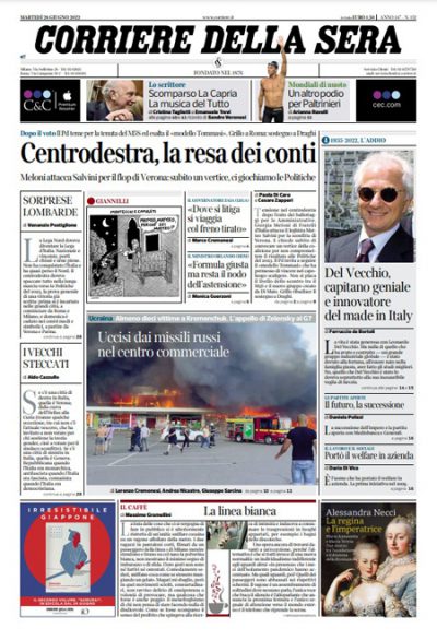 Sulla maggior parte dei giornali di oggi il titolo di apertura riguarda ancora il voto per i ballottaggi delle elezioni amministrative di domenica e soprattutto il confronto fra i partiti del centrodestra dopo gli insuccessi della coalizione. Le altre notizie principali sono la morte del fondatore di Luxottica Leonardo Del Vecchio, l’attacco con missili di ieri pomeriggio contro un centro commerciale di Kremenchuk, nell’Ucraina centrale, che secondo i primi bilanci ancora non definitivi avrebbe provocato 13 morti e 50 feriti, e la morte di Raffaele La Capria.